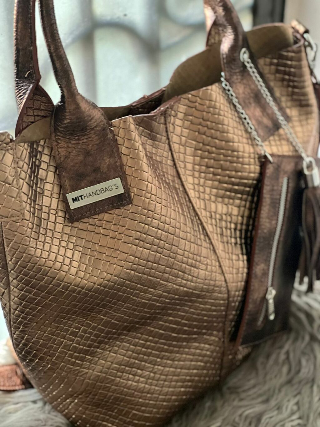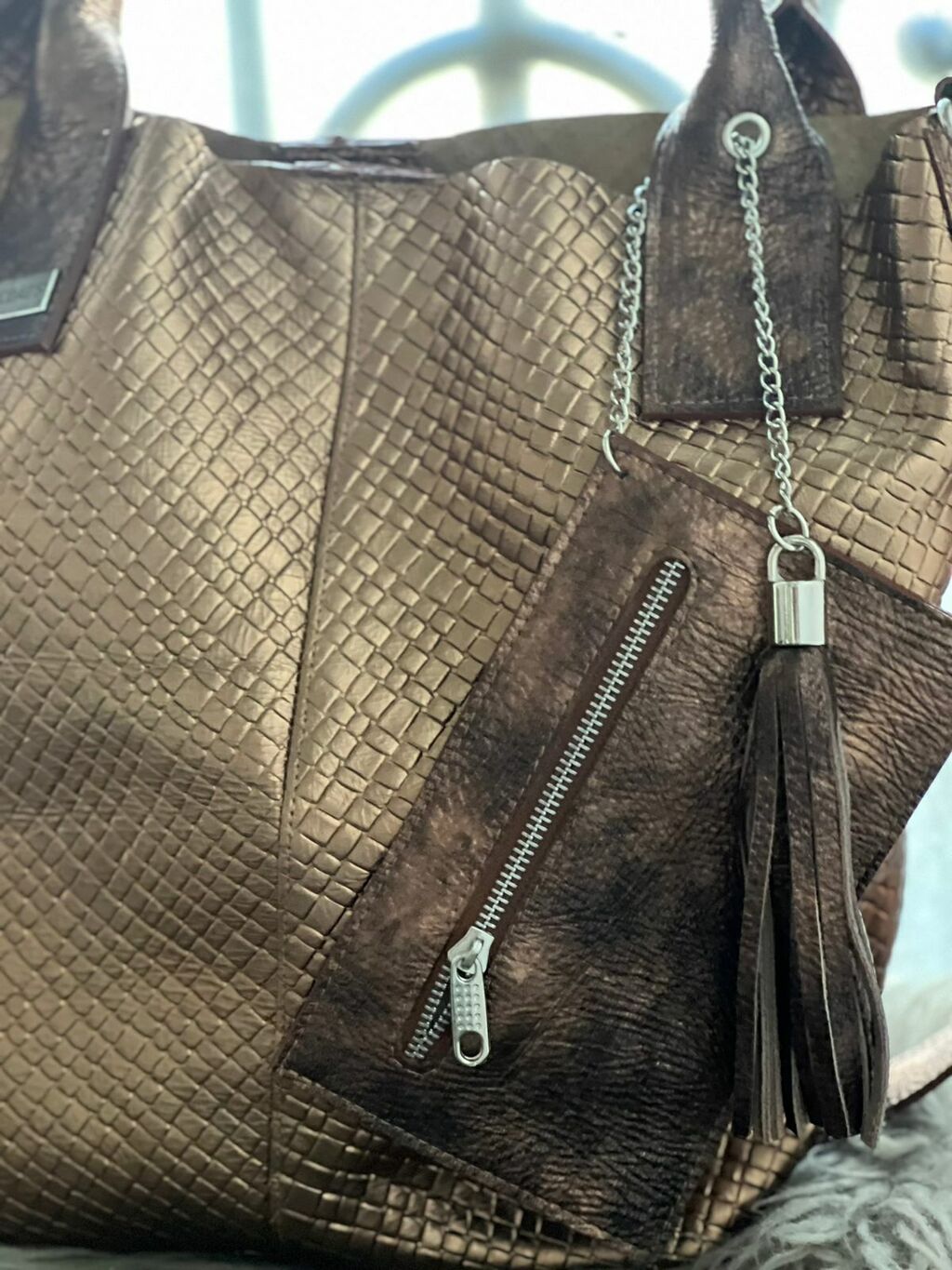 Confeccionada en denim con detalles en cuero genuino. Herrajes niquelados y tachas con cierre superior conn billetera incorporada
